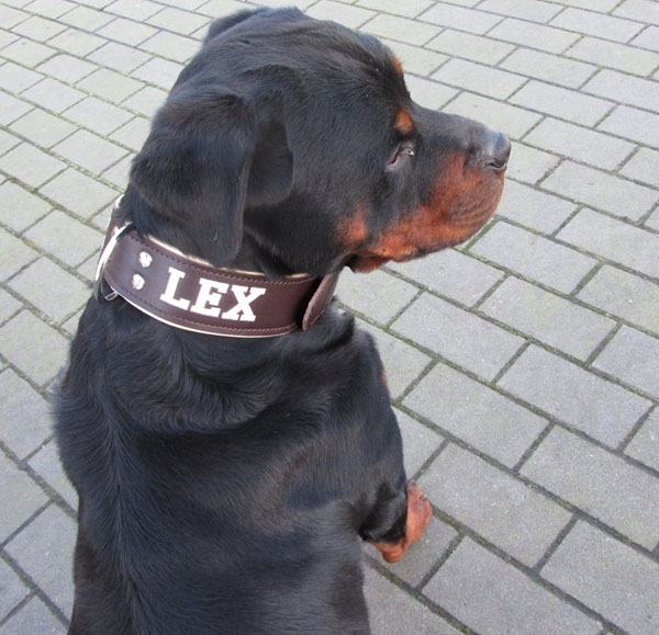 Rottweiler met halsband 50mm handgemaakt leer gevoerd met lamsleer en geborduurd met naam.